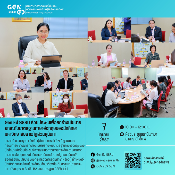 ในการนี้ อาจารย์ ดร.มาธุสร แข็งขัน ผู้อำนวยการสำนักวิชาการศึกษาทั่วไปและนวัตกรรมการเรียนรู้อิเล็กทรอนิกส์ Gen Ed SSRU ได้เข้าร่วมการประชุมในฐานะคณะกรรมการพิจารณาร่างประกาศกำหนดนโยบายการยกระดับมาตรฐานภาษาอังกฤษของนักศึกษามหาวิทยาลัยราชภัฏสวนสุนันทา โดยเป็นการหารือแนวทางการยกระดับมาตรฐานภาษาอังกฤษของนักศึกษามหาวิทยาลัย ให้สอดคล้องกับนโยบายใหม่ของกระทรวงอุดมศึกษา วิทยาศาสตร์และนวัตกรรม (อว.) ที่มีการกำหนดให้นักศึกษาหรือบัณฑิตต้องมีระดับความสามารถทางภาษาอังกฤษตามมาตรฐาน CEFR จากระดับ B1 เป็น B2 เพื่อให้นักศึกษามีความสามารถทางภาษาอังกฤษที่เพียงพอสำหรับการทำงานและการศึกษาในอนาคต