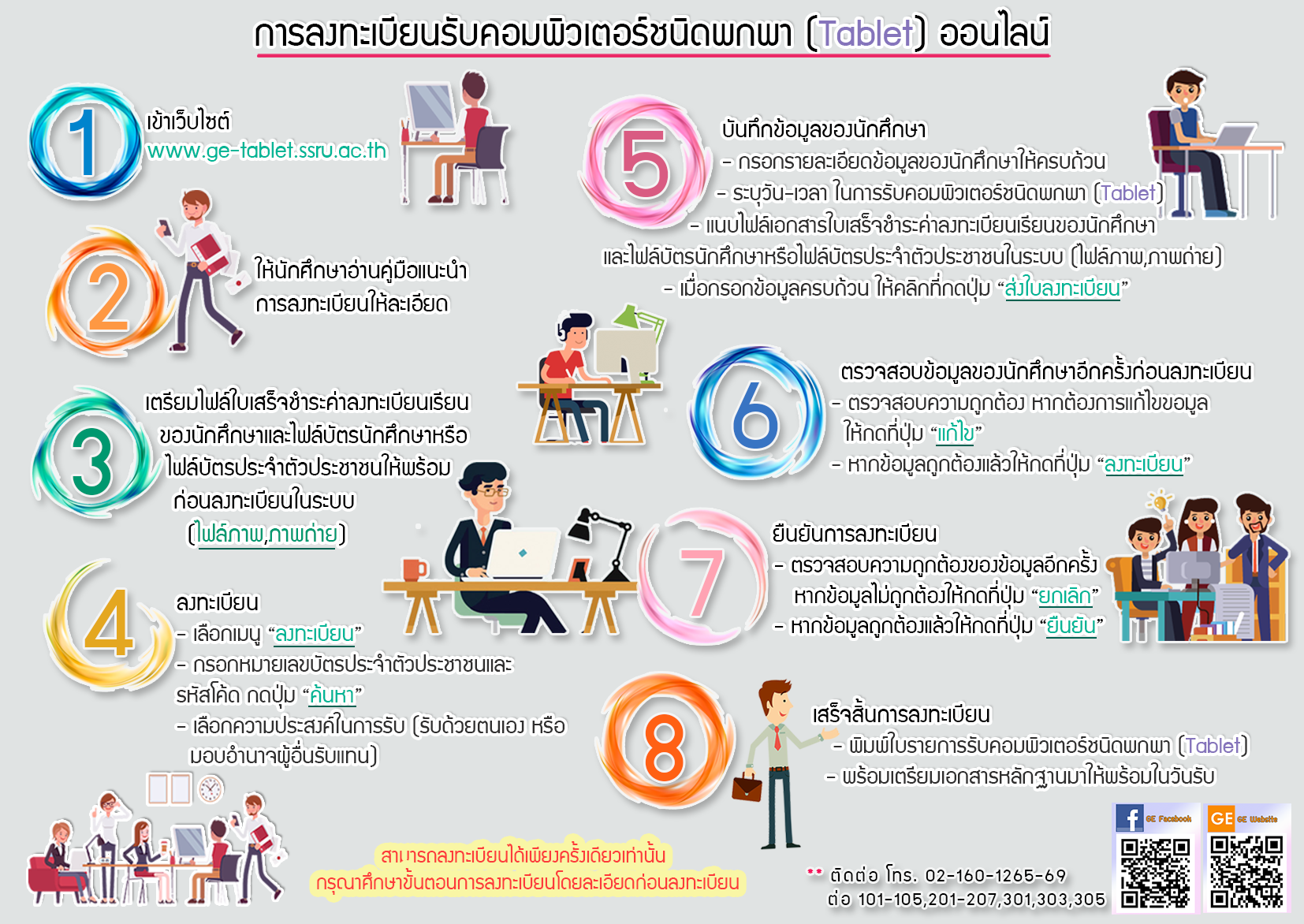 1. In the event that the information is not found in the registration system for a portable computer (Tablet), but there is evidence of a receipt of payment for the registration fee with media and learning materials Can contact to report correction For more information, please call 02-1601265 ext. 301, 303 (notify one day before the pick up date).