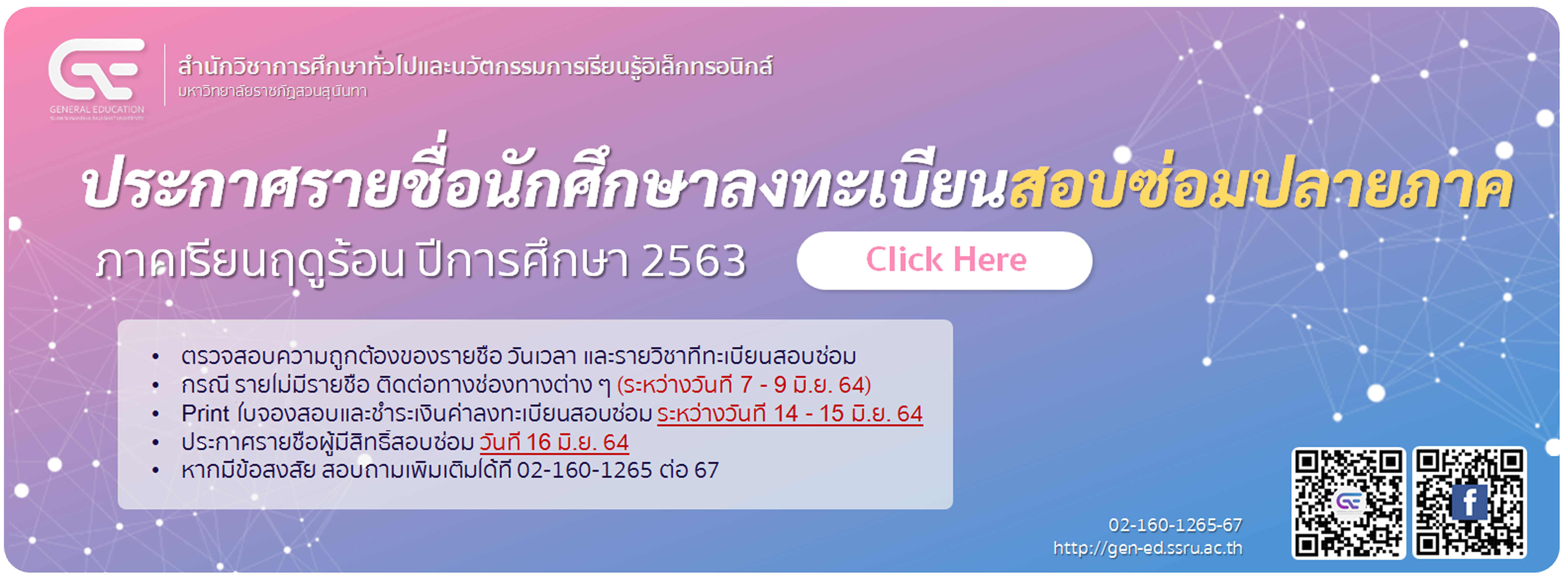 >>> ดาวน์โหลด  ประกาศรายชื่อนักศึกษาลงทะเบียนสอบซ่อมปลายภาค ภาคเรียนฤดูร้อน ปีการศึกษา 2563.pdf
