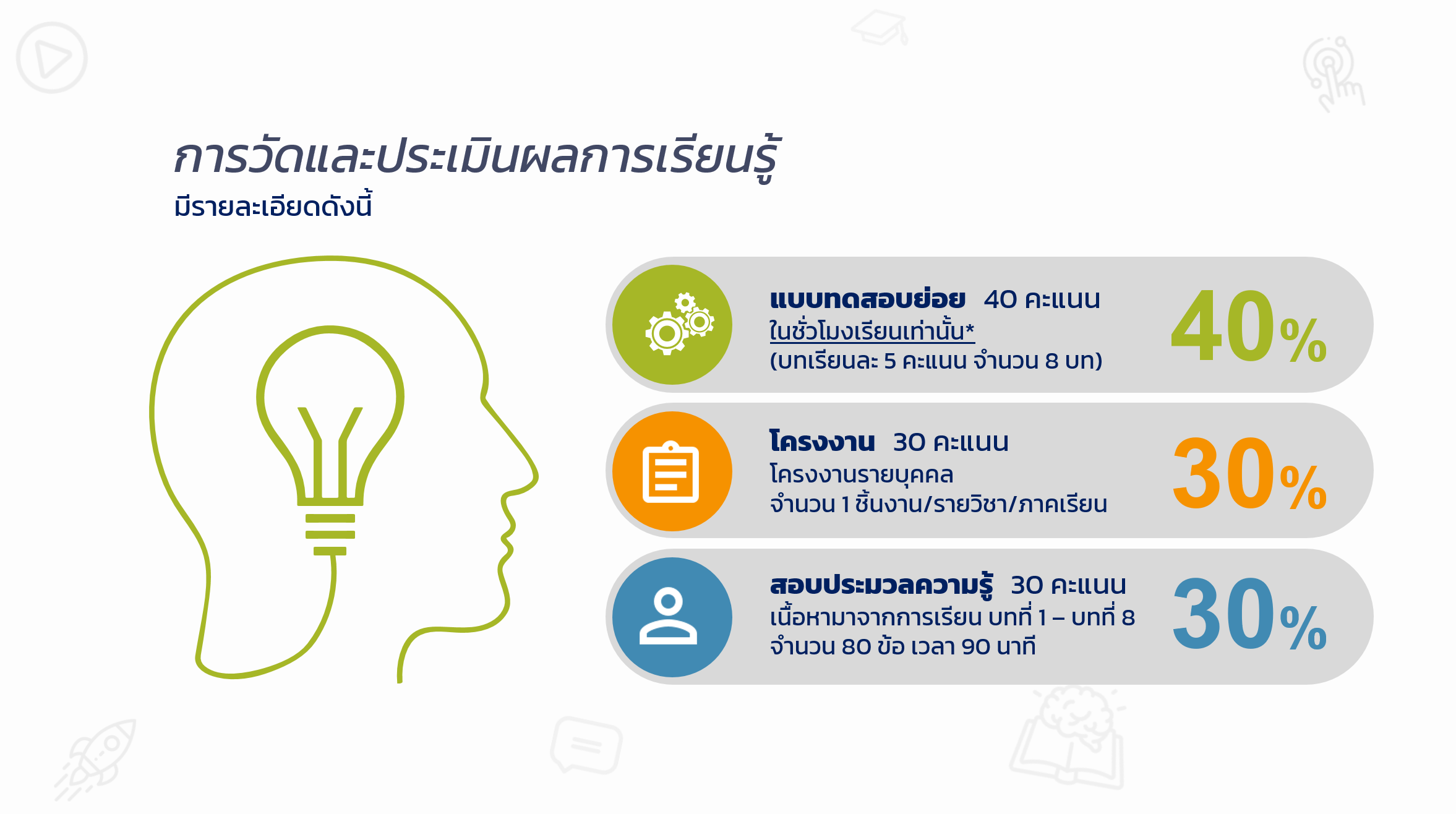 Project submitted online, 30 points Final exam, 30 points // Let me tell you some tips. You can get a full score by participating and doing the exercise lesson in every class.