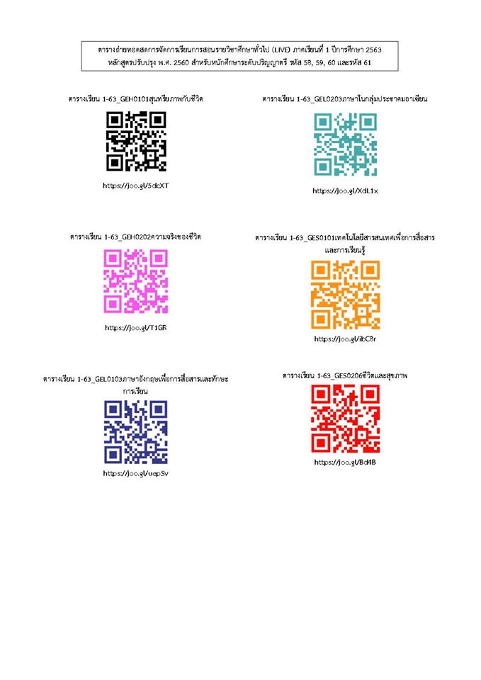 ตารางถ่ายทอดสดการจัดการเรียนการสอนรายวิชาศึกษาทั่วไป (LIVE) ภาคเรียนที่ 1 ปีการศึกษา 2563 หลักสูตรปรับปรุง พ.ศ. 2560 สำหรับนักศึกษาระดับปริญญาตรี รหัส 58, 59, 60 และรหัส 61