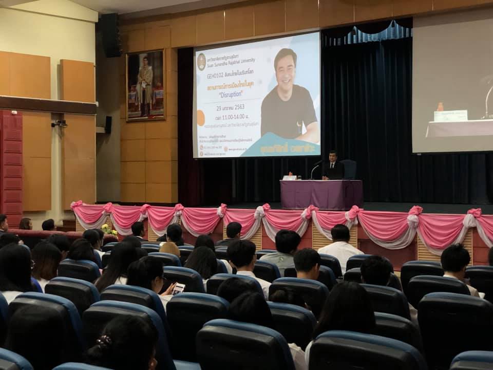 วันพุธที่ 29 มกราคม 2563 เวลา 11.00 -14.00 น. สำนักวิชาการศึกษาทั่วไปฯ ( GE ) ได้จัดกิจกรรมการเรียนการสอน หมวดวิชาศึกษาทั่วไป เชิญวิทยากรมาบรรยายให้ความรู้แก่นักศึกษาที่เรียนในรายวิชาศึกษาทั่วไป เน้นการมุ่งผลลัพธ์การเรียนรู้ของนักศึกษาจากการเรียนวิชาจีอีให้เป็นไปตามปรัชญาที่เน้นการสร้างคนให้เต็มคน รูปแบบการเรียนการสอนจึงเป็นไปในลักษณะของการเปิดโลกทัศน์ให้นักศึกษามีมุมมองต่อโลกและชีวิตในทางที่ดี การเรียนการสอนในแต่ละครั้งมุ่งเน้นให้นักศึกษาเกิดแรงบันดาลและมีโลกทัศน์ที่กว้างขวาง สามารถนาความรู้ไปใช้ในการดาเนินชีวิตและดำรงตนอยู่ในสังคมได้เป็นอย่างดี โดยได้รับเกียรติจาก นายอภิสิทธิ์ เวชชาชีวะ (อดีตนายกรัฐมนตรี) การบรรยายพิเศษในหัวข้อ สถานการณ์การเมืองไทย ในยุค“Disruption” ณ หอประชุมสุนันทานุสรณ์