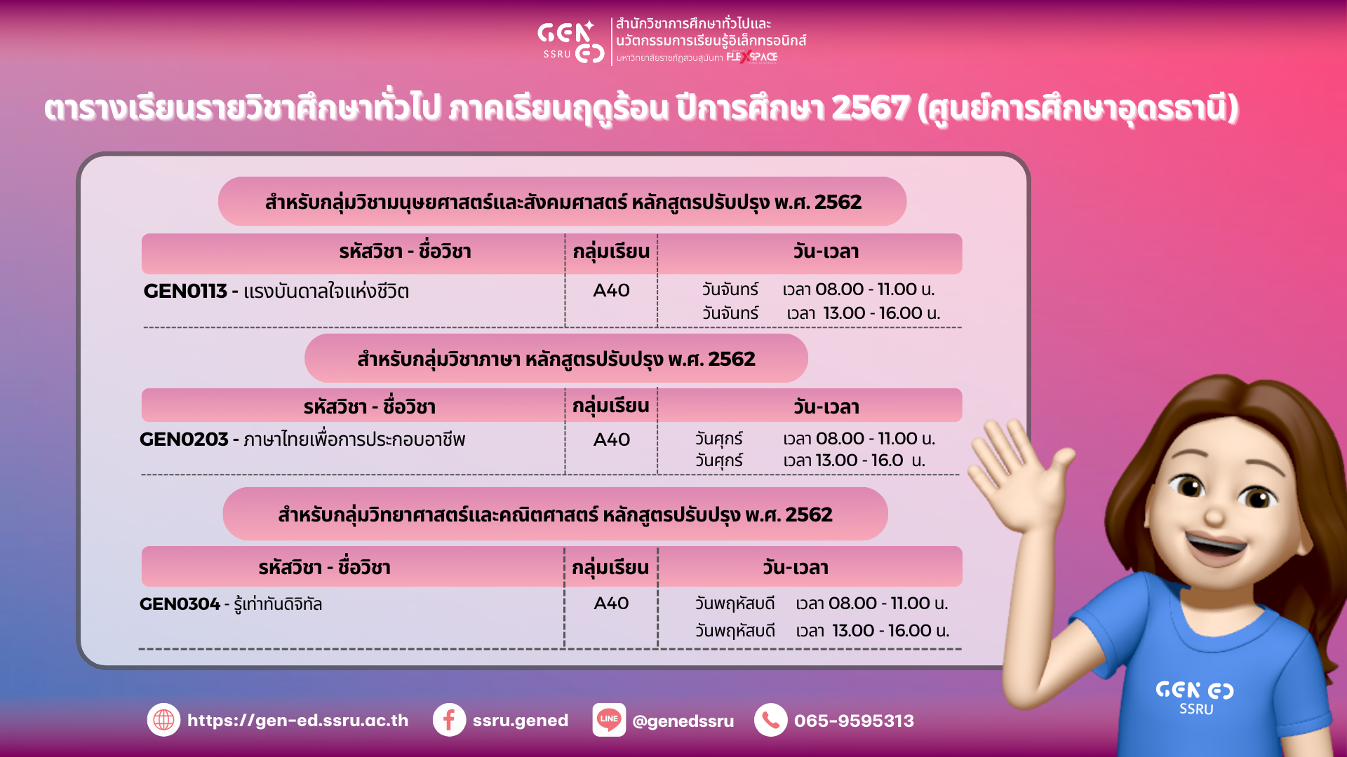 ตารางเรียนรายวิชาศึกษาทั่วไป ภาคเรียนฤดูร้อน ปีการศึกษา 2567