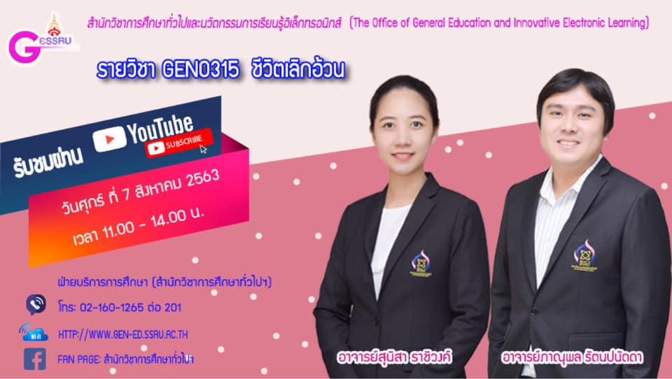 ขอเชิญรับฟังบรรยาย GEN0315 ชีวิตเลิกอ้วน โดย อาจารย์สุนิสา ราชิวงค์ พร้อมด้วย อาจารย์ภาณุพล รัตนปนัดดา
