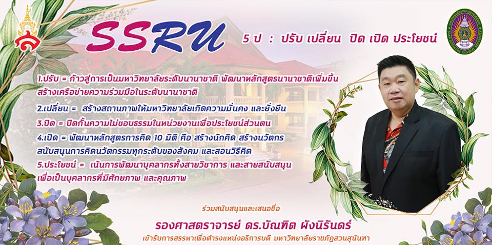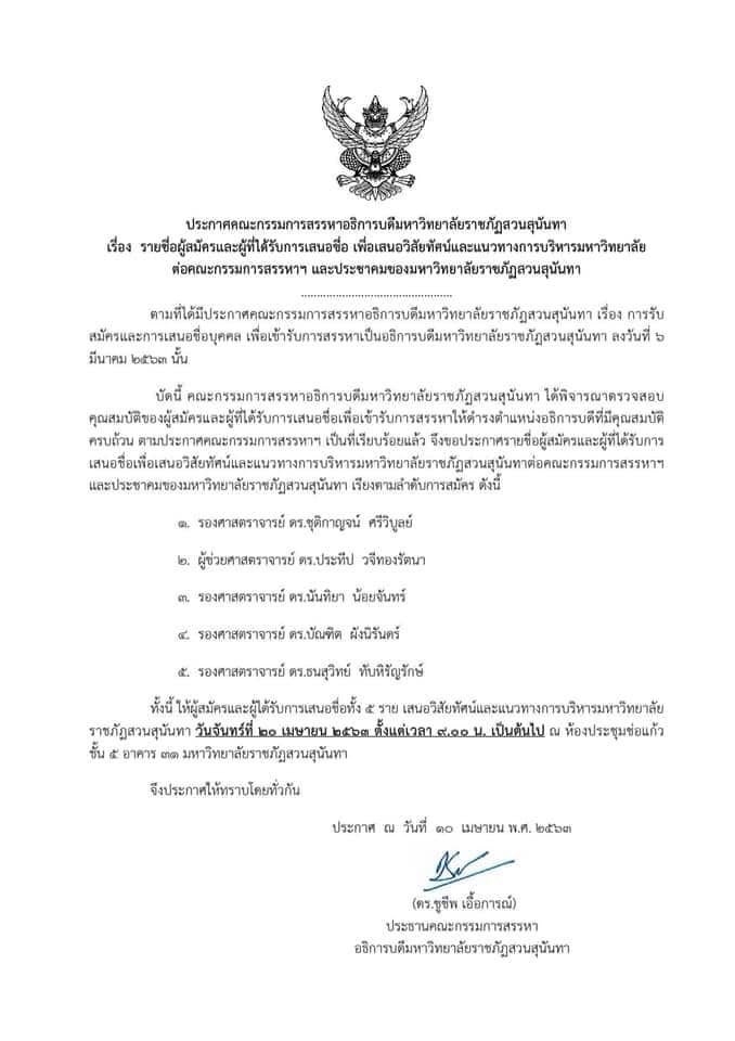 ประกาศคณะกรรมการสรรหาอธิการบดีมหาวิทยาลัยราชภัฏสวนสุนันทา ผู้สมัครและผู้ได้รับการเสนอชื่อทั้ง 5 ราย เสนอวิสัยทัศและแนวทางการบริหารมหาวิทยาลัยฯ ในวันจันทร์ที่ 20 เมษายน 2563 ตั้งแต่เวลา 09.00 น. เป็นต้นไป ณ ห้องประชุมช่อแก้ว ชั้น 5 อาคาร 31 ทั้งนี้ เนื่องจากประกาศมหาวิทยาลัยราชภัฏสวนสุนันทา เรื่อง มาตรการป้องกันการแพร่ระบาด ของเชื้อโรค COVID-19 (ฉบับที่ 4) และ (ฉบับที่ 8 การเสนอวิสัยทัศน์ฯ จะเป็นการบันทึกภาพและวีดีโอเพื่อนำไปเผยแพร่ในช่องทาง Ssru Tube เพื่อให้ประชาคมรับทราบต่อไป