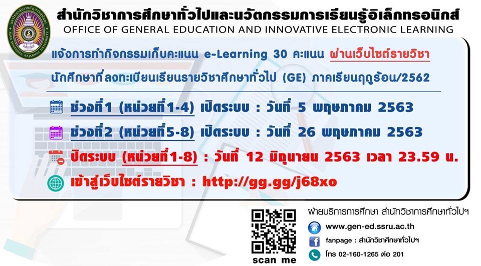 แจ้งการทำกิจกรรมเก็บคะแนน e-Learning ช่วงที่ 1 หน่วยที่ 1 - 4 เเละ ช่วงที่ 2 หน่วยที่ 5 -8 ผ่านเว็บไซต์รายวิชาสำหรับนักศึกษาที่ลงทะเบียนเรียนรายวิชาศึกษาทั่วไป (GE)ภาคเรียนฤดูร้อน ปีการศึกษา 2562