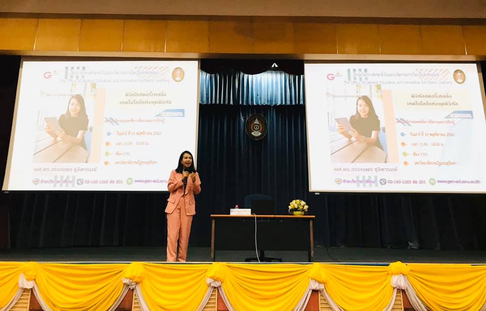 วันที่ 16 พฤศจิกายน 2562 สำนักวิชาการศึกษาทั่วไปและนวัตกรรมการเรียนรู้อิเล็กทรอนิกส์ ได้จัดการบรรยายกิจกรรมการเรียนการสอน หมวดวิชาศึกษาทั่วไป โดยได้รับเกียรติจาก ผู้ช่วยศาสตราจารย์ ดร.วรรณพร ชูจิตารมย์ บรรยายในรายวิชาศึกษาทั่วไหัวข้อ “ดิจิทัลสตอรี่เทลลิ่ง เทคโนโลยีแห่งยุคดิจิทัล ” เวลา 11.00 น. - 14.00 น. ณ ห้องเรียน 1701 หอประชุมสุนันทานุสรณ์