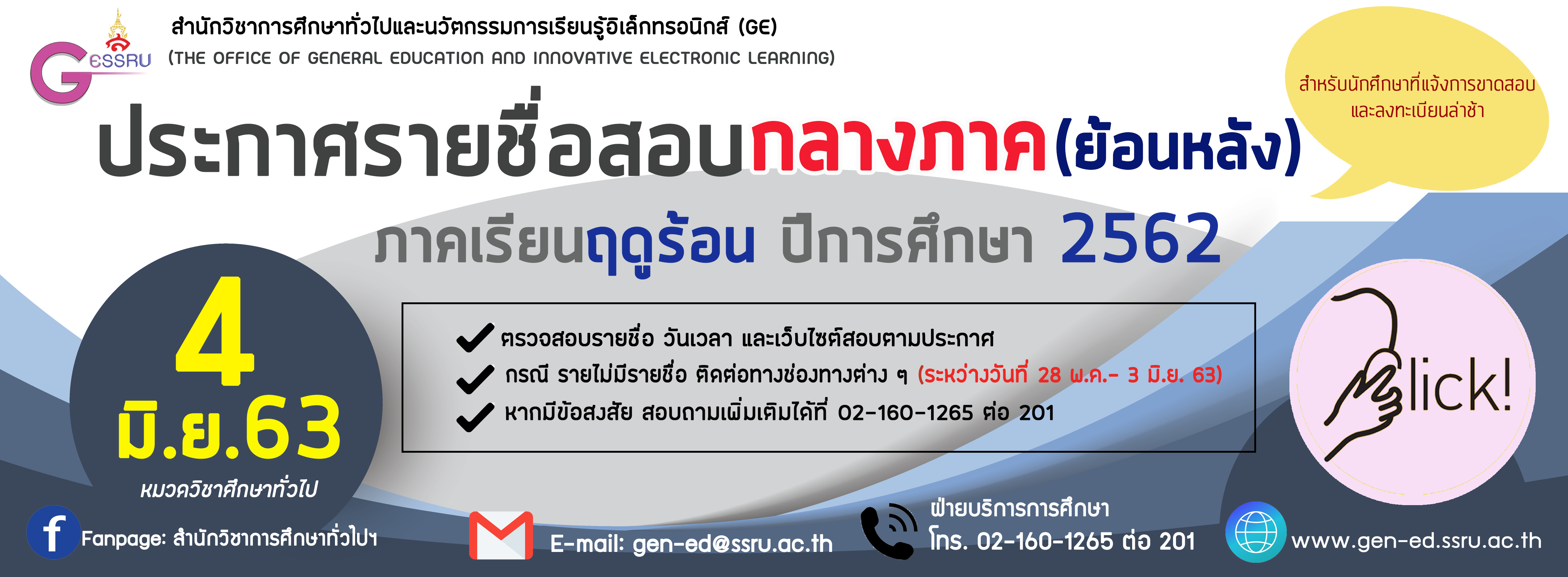 ตรวจสอบรายชื่อนักศึกษาสอบกลางภาค (ย้อนหลัง) ภาคเรียนฤดูร้อน ปีการศึกษา 2562 >> คลิกเพื่อตรวจสอบ