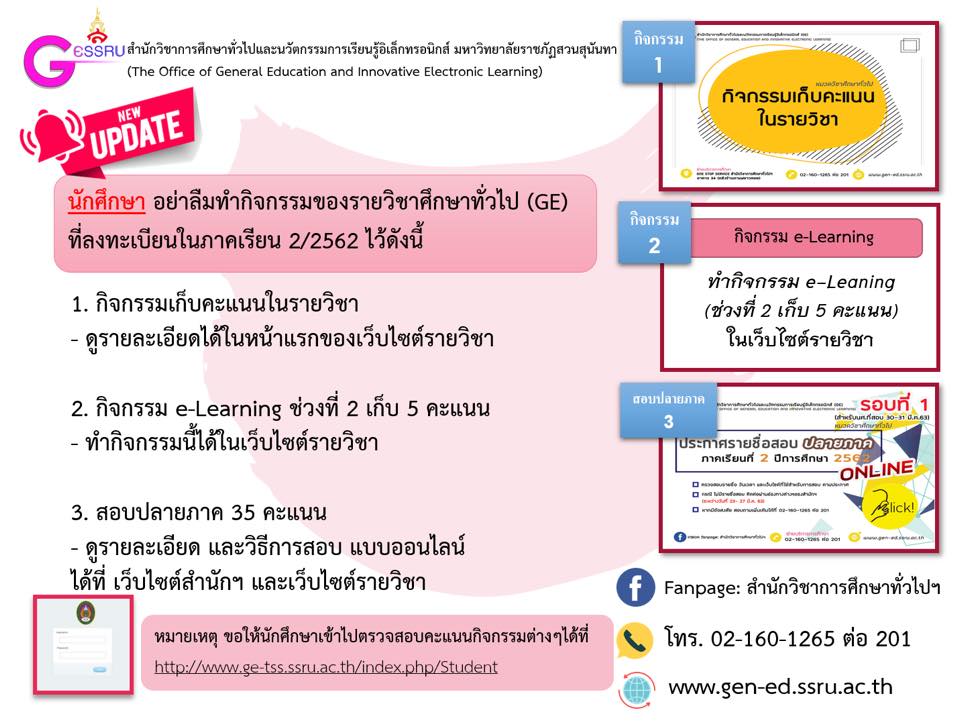 ติดตามข่าวสารเพิ่มเติมได้ที่ : www.gen-ed.ssru.ac.th