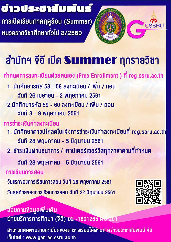 ข่าวประชาสัมพันธ์การเปิดเรียนภาคฤดูร้อน (Summer)หมวดรายวิชาศึกษาทั่วไป 3/2560
