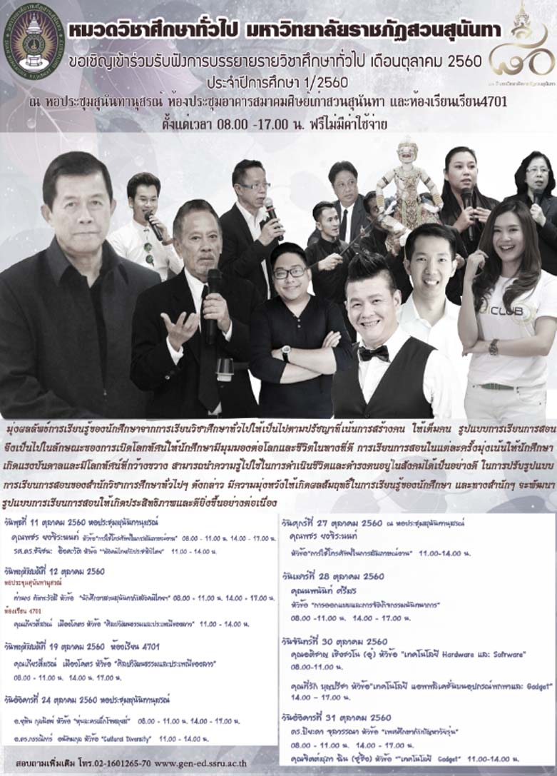 ทั้งนี้สำนักวิชาการศึกษาทั่วไปและนวัตกรรมการเรียนรู้อิเล็กทรอนิกส์ ขอเชิญเข้าร่วมรับฟังการบรรยาย กิจกรรมการเรียนการสอนหมวดวิชาศึกษาทั่วไป พบกับกิจกรรมการบรรยายเนื้อหาในรายวิชาศึกษาทั่วไปโดย วิทยากรผู้ทรงคุณวุฒิ นักพูด และบุคคลสำคัญในแวดวงต่าง ๆ ของไทย มาบรรยายในรายวิชาศึกษาทั่วไป ในเดือนตุลาคม พ.ศ.2560 ณ หอประชุมสุนันทานุสรณ์ อาคารสมาคมศิษย์เก่าสวนสุนันทา และห้องเรียน 4701 อาคาร 47 คณะเทคโนโลยีอุตสาหกรรม ตั้งแต่เวลา 08.00 น. เป็นต้นไป ฟรีไม่เสียค่าใช้จ่าย