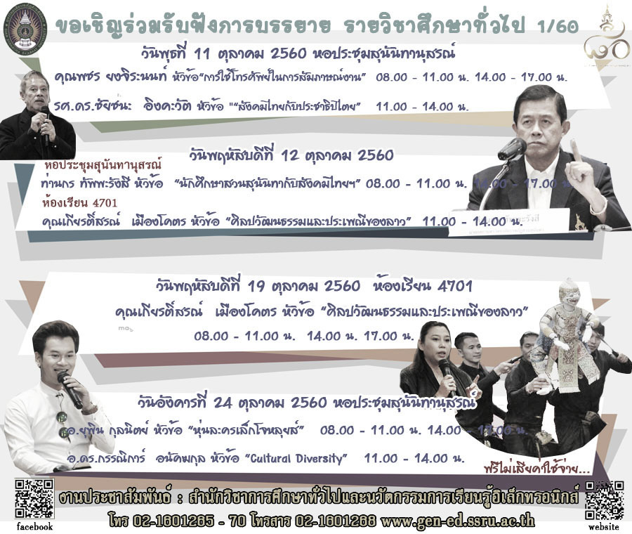 ทั้งนี้สำนักวิชาการศึกษาทั่วไปและนวัตกรรมการเรียนรู้อิเล็กทรอนิกส์ ขอเชิญเข้าร่วมรับฟังการบรรยาย กิจกรรมการเรียนการสอนหมวดวิชาศึกษาทั่วไป พบกับกิจกรรมการบรรยายเนื้อหาในรายวิชาศึกษาทั่วไปโดย วิทยากรผู้ทรงคุณวุฒิ นักพูด และบุคคลสำคัญในแวดวงต่าง ๆ ของไทย มาบรรยายในรายวิชาศึกษาทั่วไป ในเดือนตุลาคม พ.ศ.2560 ณ หอประชุมสุนันทานุสรณ์ อาคารสมาคมศิษย์เก่าสวนสุนันทา และห้องเรียน 4701 อาคาร 47 คณะเทคโนโลยีอุตสาหกรรม ตั้งแต่เวลา 08.00 น. เป็นต้นไป ฟรีไม่เสียค่าใช้จ่าย