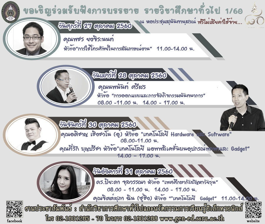 ทั้งนี้สำนักวิชาการศึกษาทั่วไปและนวัตกรรมการเรียนรู้อิเล็กทรอนิกส์ ขอเชิญเข้าร่วมรับฟังการบรรยาย กิจกรรมการเรียนการสอนหมวดวิชาศึกษาทั่วไป พบกับกิจกรรมการบรรยายเนื้อหาในรายวิชาศึกษาทั่วไปโดย วิทยากรผู้ทรงคุณวุฒิ นักพูด และบุคคลสำคัญในแวดวงต่าง ๆ ของไทย มาบรรยายในรายวิชาศึกษาทั่วไป ในเดือนตุลาคม พ.ศ.2560 ณ หอประชุมสุนันทานุสรณ์ อาคารสมาคมศิษย์เก่าสวนสุนันทา และห้องเรียน 4701 อาคาร 47 คณะเทคโนโลยีอุตสาหกรรม ตั้งแต่เวลา 08.00 น. เป็นต้นไป ฟรีไม่เสียค่าใช้จ่าย