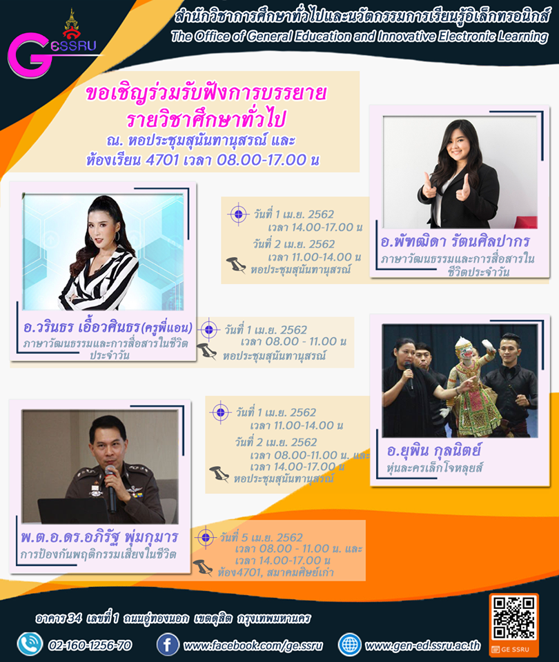 ขอเชิญร่วมรับฟังการบรรยายรายวิชาศึกษาทั่วไป ณ. หอประชุมสุนันทานุสรณ์ และห้องเรียน 4701 เวลา 08.00-17.00 น.