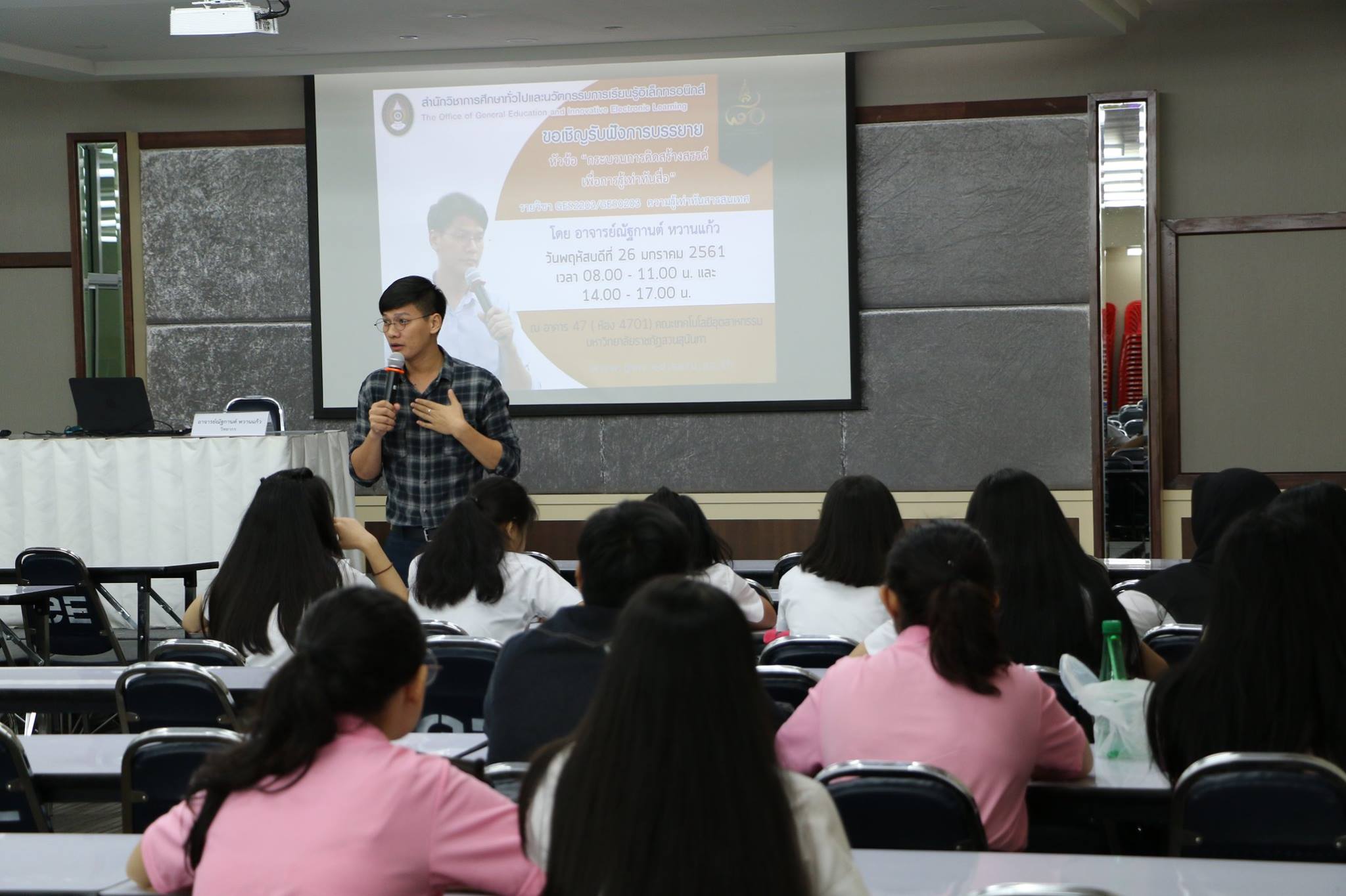 วันที่ 26 มกราคม 2561 ได้รับเกียรติจาก อ.ณัฐกานต์ หวานแก้ว บรรยายรายวิชาศึกษาทั่วไป หัวข้อ “กระบวนการคิดสร้างสรรค์เพื่อการรู้เท่าทันสื่อ ” เวลา 08.00 - 11.00 น. และเวลา 14.00 - 17.00 น.ณ ห้องเรียน 4701 คณะเทคโนโลยีอุตสาหกรรม