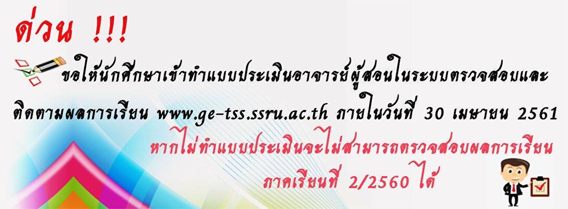 อย่าลืมเข้าไปทำแบบประมินอาจารย์ผู้สอนกันนะค่ะ พรุ่งนี้วันสุดท้ายแล้วจ้า # www.ge-tss.ssru.ac.th