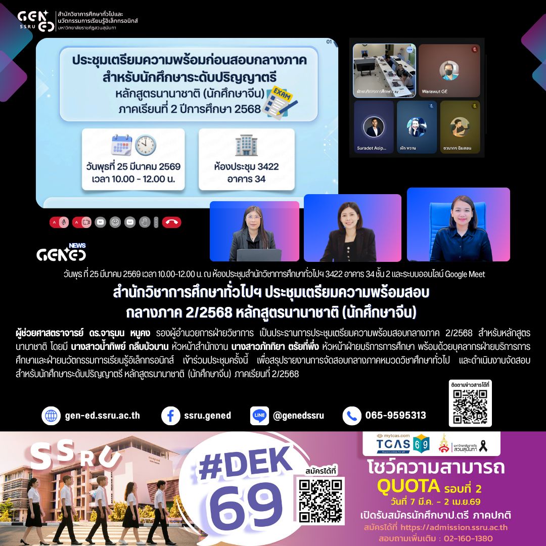 วันพุธที่ 25 มีนาคม 2569 เวลา 10.00 – 12.00 น. ณ ห้องประชุมสำนักวิชาการศึกษาทั่วไปฯ ห้อง 3422 อาคาร 34 ชั้น 2 และผ่านระบบออนไลน์ Google Meet สำนักวิชาการศึกษาทั่วไปฯ จัดประชุมเตรียมความพร้อมการสอบกลางภาค ภาคเรียนที่ 2/2568 สำหรับหลักสูตรนานาชาติ (นักศึกษาจีน)